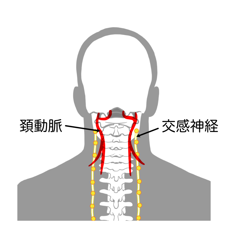 動脈血は首の両側の頸動脈を通って脳に上がっていきます。酸素が供給されないと人間の脳はせいぜい2分~3分しか生き延びれないので「頸動脈洞受容体」が頸動脈内の血圧を常に監視しています。